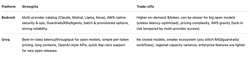 - Latency & Throughput: Groq routinely leads on open models (Llama/Mixtral/Gemma): lower time-to-first-token and higher tokens/sec. Bedrock’s latency-optimized options narrow the gap for select models (e.g., Claude 3.5 Haiku), and Bedrock tends to win on multi-model reliability.